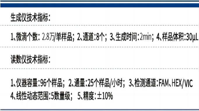 本項目產品突破了“多重微弱微滴熒光激發技術與微滴特征識別算法”、“百微米級微流控芯片的批量化制備”和“數字PCR通用試劑耗材制備”等關鍵技術,已經形成了性能穩定的數字PCR微滴生成儀和讀數儀,配套微滴生成芯片和通用試劑耗材,組成了測試性能穩定可靠的數字PCR測試平臺,市場潛力巨大。適用于腫瘤伴隨診斷、病毒含量分析、藥物殘留測試和基因定量檢測、環境及食品監管、制藥等應用場景。