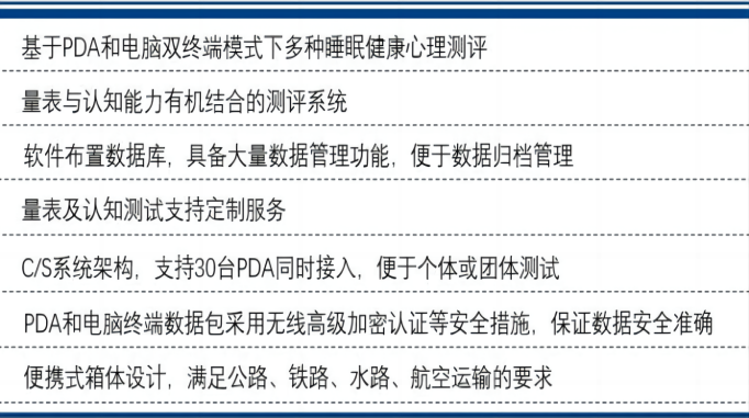 便攜式心理與認知能力測評系統,簡稱PVT檢測儀,主要用于睡眠健康與認知能力測評,通過匹茲堡睡眠質量指數測評,焦慮自評量表、抑郁自評量表、心境狀態量表等40余種心理健康測評及視警覺性測試警覺測試(PVT)等10余種認知能力測試,評估相關行業人員的心理、睡眠、認知與壓力應對能力,進一步提升一體化睡眠覺醒與認知功能的實時監控與評估技術水平。適用于學校等相關人員的心理與認知能力測評。