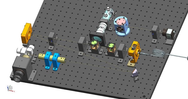 機(jī)械設(shè)計(jì)需要保證所有光學(xué)部件均能光學(xué)平板上布置并充分利用空間,需要在不改動(dòng)光學(xué)原理的情況下調(diào)整零件布局,并且針對(duì)每個(gè)光學(xué)件的結(jié)構(gòu)尺寸特點(diǎn),設(shè)計(jì)具有可調(diào)節(jié)的組件裝置,保證能夠與光軸對(duì)齊,滿足光學(xué)設(shè)計(jì)中的尺寸要求。初步整體設(shè)計(jì)方案如下: